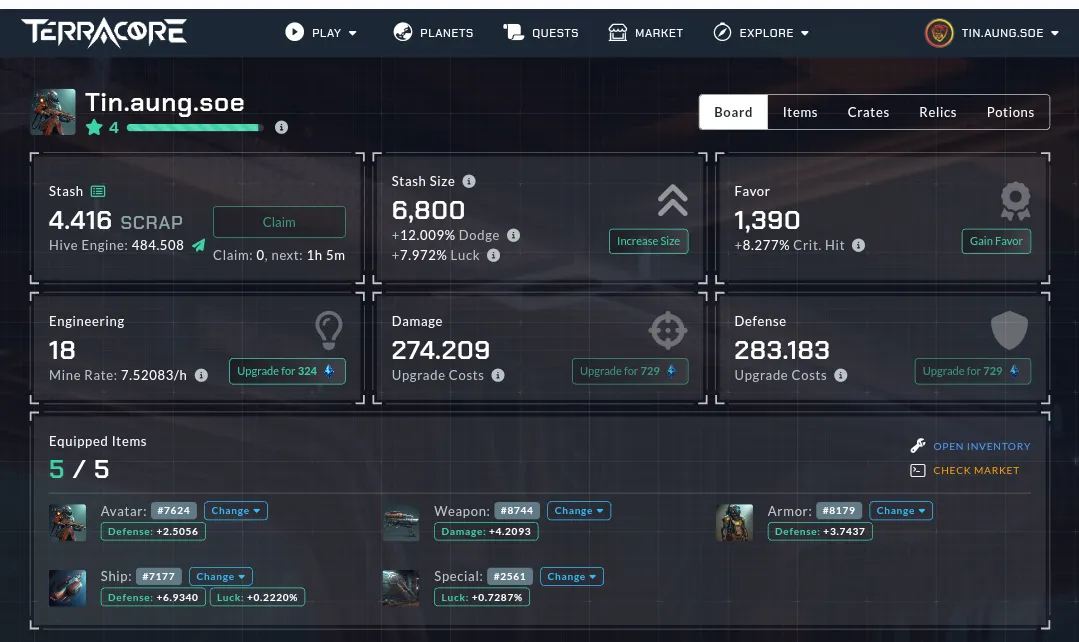 Now my TerraCore Game Stats are Stash Size 6800, Favor 1390, Engineering 18, Damage 274.209, Defense 283.183 and Equipments Horizon Ship, Scanner Droid Avatar, Micro Blaster, Heavy Battle Suit and Torque Wrench.
