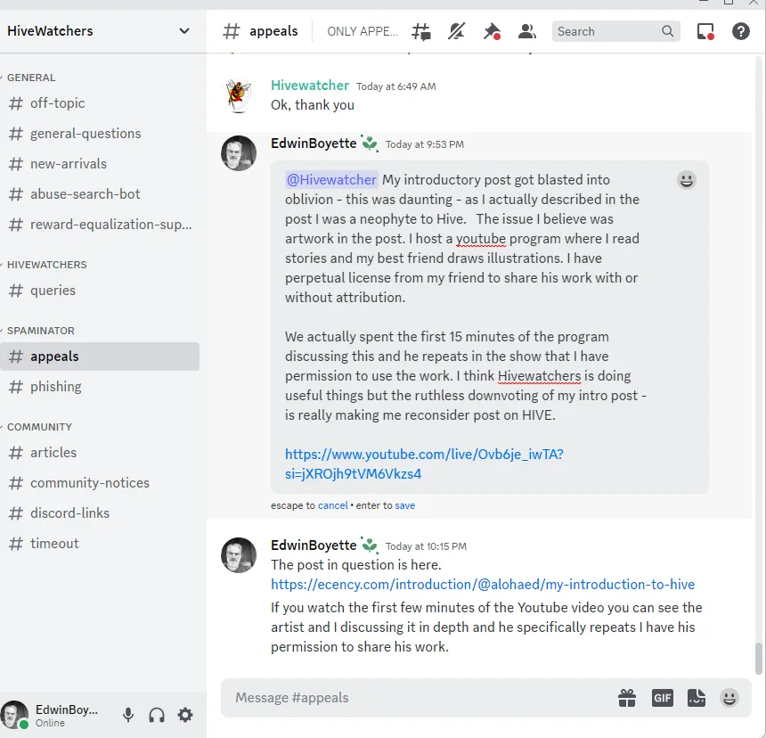 @hivewatchers potentially does some good things for Hive - but in my case it has genuinely blunted my enthusiasm to use this platform. I posted an introductory post and included artwork performed during my YouTube program.