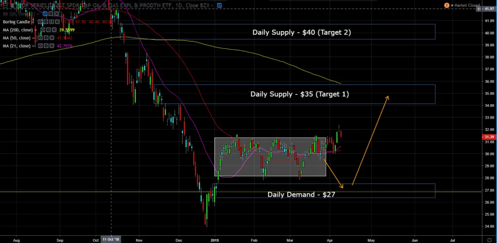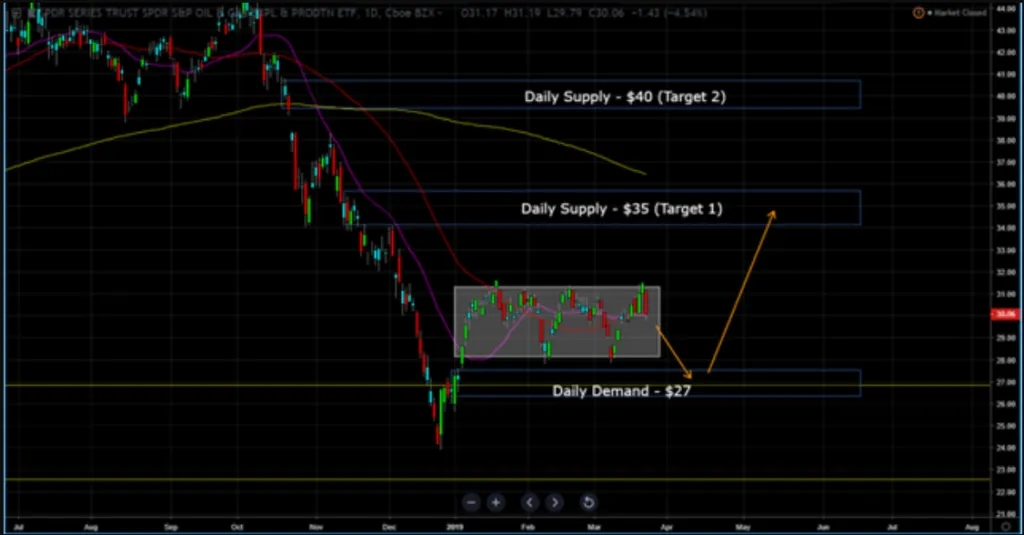 Daily Chart (Entry Time Frame) – price has been in a $3 range since January. But since price is lower on the bigger timeframe range, the chart suggest if price pulls back to the daily demand at $27 to go long with a first target at $35.