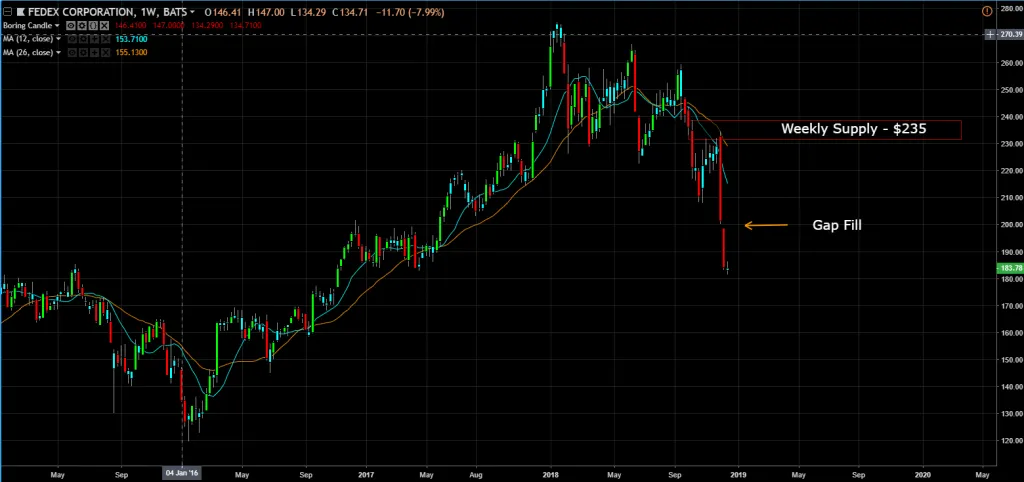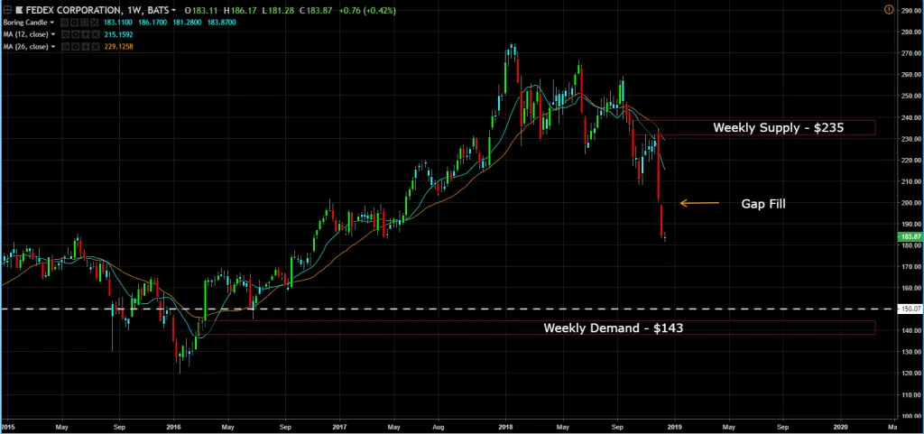 FedEx Corporation (FDX) is on a down spiral, down more than 20% in December and down more than 30% from January’s all-time high and trading near a 52 week low. Back in September, FedEx reported earnings that beat on revenue, but missed profit estimates. During the earnings call, FedEx decreased their 2019 numbers because of the ongoing US-China tariff war, which has already affected 10% of its businesses in China. On that news FedEx sold off hard.