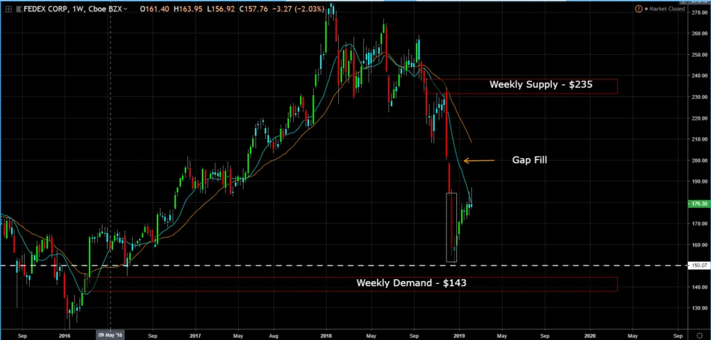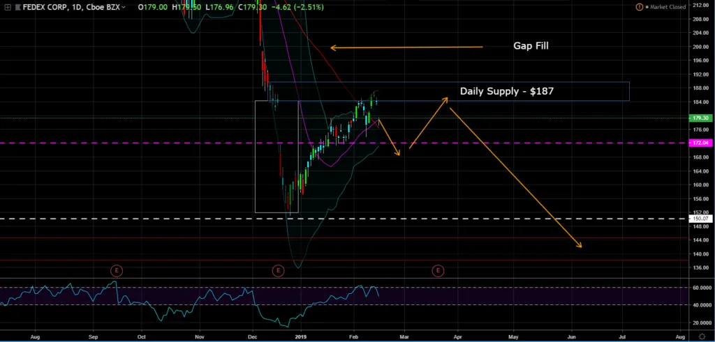 FedEx price did pull back into a daily demand zone, so one possible scenario is a break of $172, a pull back, than a drop to the weekly demand zone at $143.