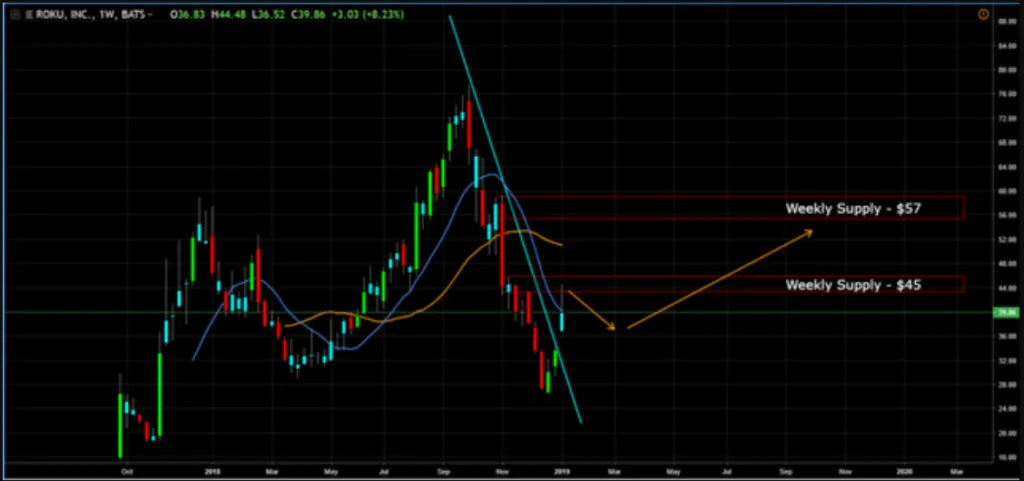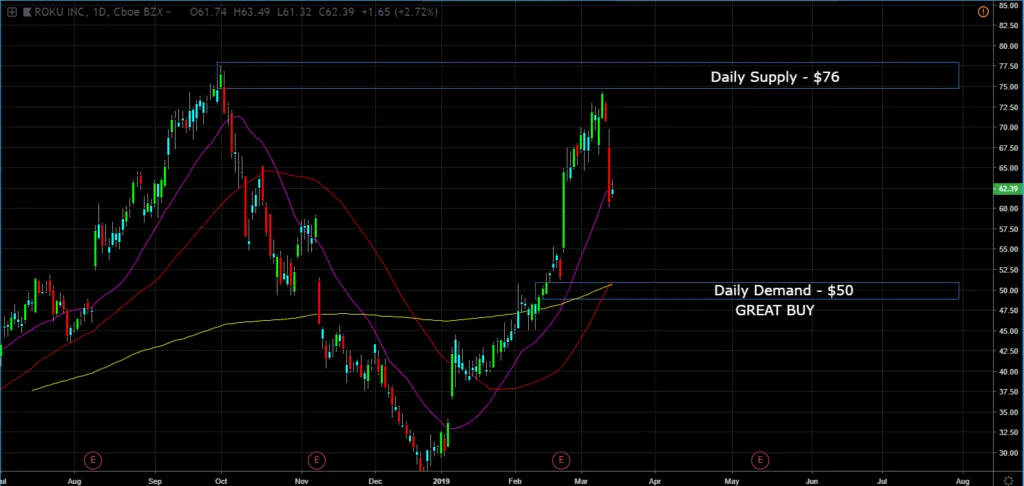 The chart suggests buy Roku if and when price pulls back to the daily demand level at $50.
