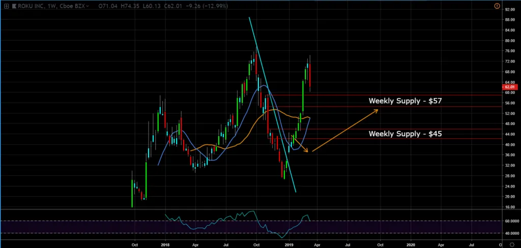 You thought the S&P 500 was rocking higher from the December Christmas lows, have you seen a Roku chart lately. Roku’s share price rose 47% in January and then rose 48% in February. Needless to say, the weekly supply at $57 was hit and then some.
