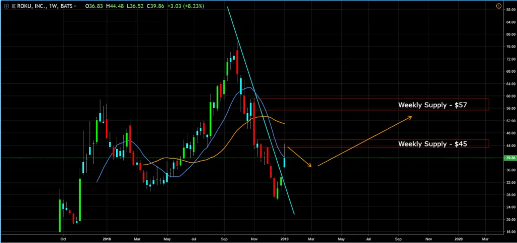 If price can clear the weekly supply at $45(price pull back from that level now), the chart suggest price will move to the next level at $57.