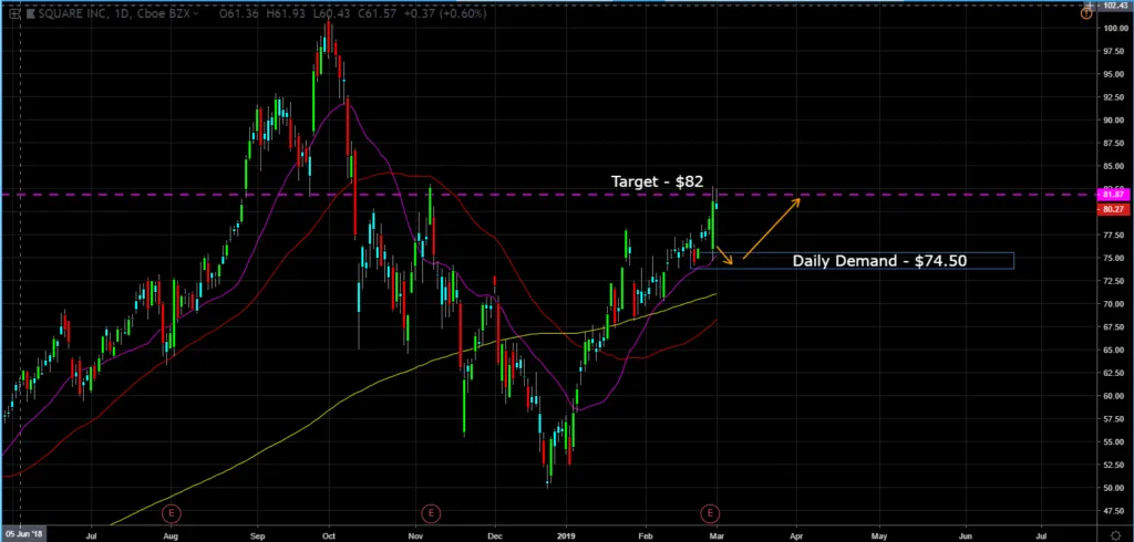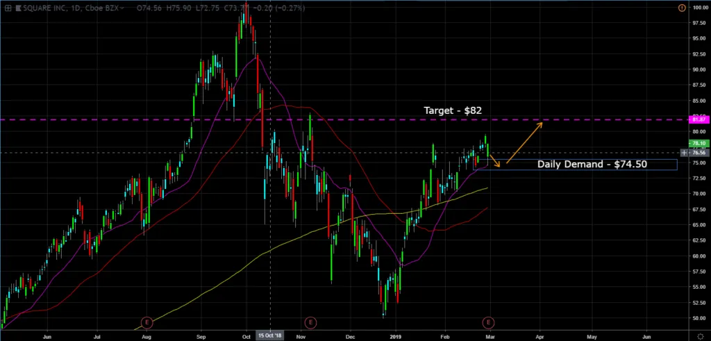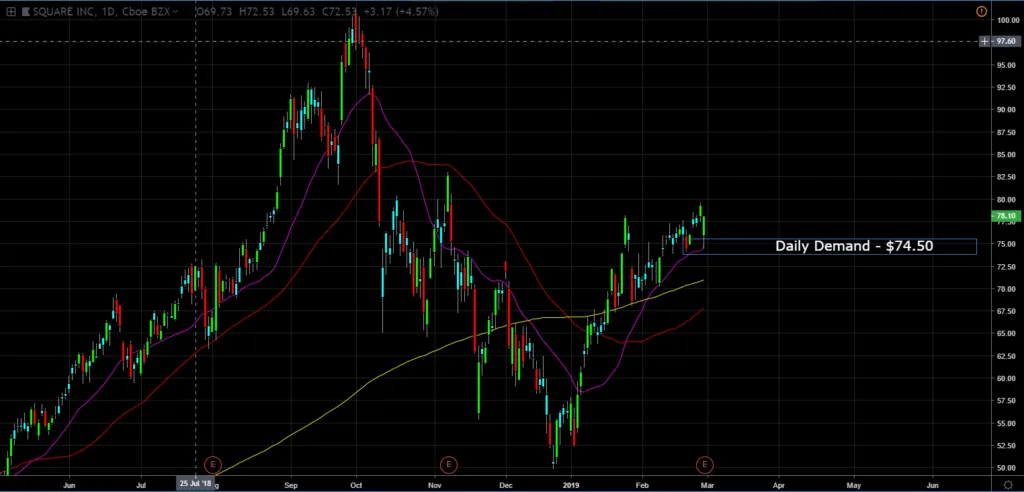 Square announced earnings this past week. The company reported stronger-than-expected fourth-quarter financial results, but disappointed investors when they forecast their numbers for the first quarter. On the news the stock price dropped after hours and opened right in a daily demand zone this morning.