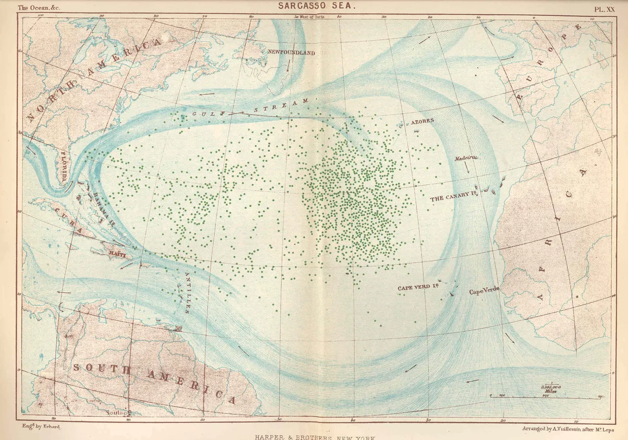 In questa porzione di Oceano Atlantico convergono alcune correnti marine, e questo fa sì che si concentri nella zona una grande quantità di plastica. Il danno è grave, perchè si tratta di un luogo molto ricco di biodiversità, che ora è in pericolo. Ad aggravare ancora di più la situazione è il fatto che la zona si trova in acque internazionali. Questo rende un intervento di tutela molto complicato, a causa della difficile legislazione che governa questo genere di problemi.