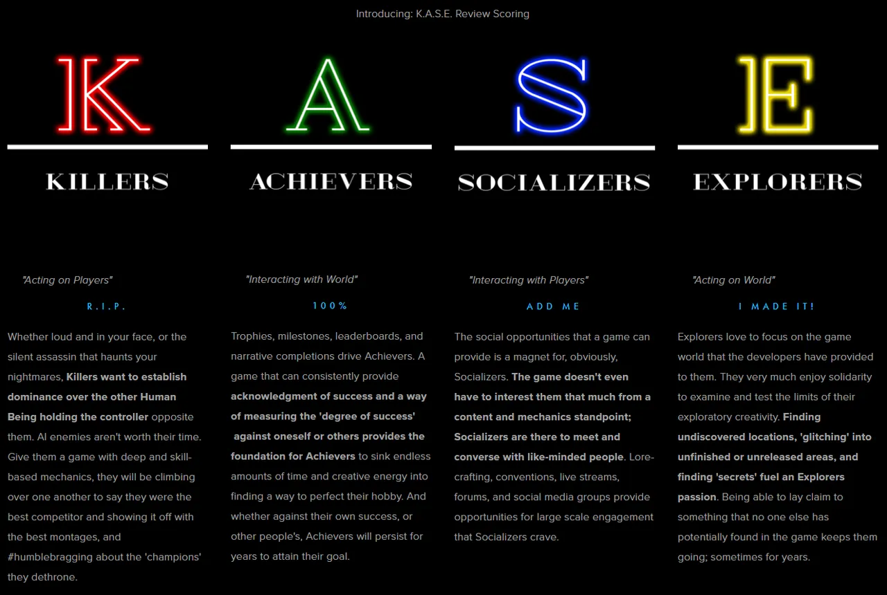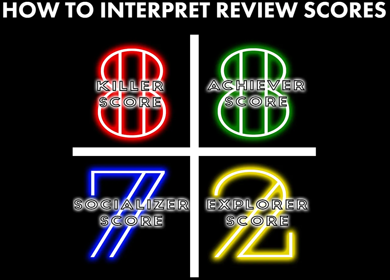 Instead of the traditional review structure that results in a single cumulative score (often a scale of 0 to 10), I propose offering 4 scores for each game, each of the 4 representing a meta analysis approach for each quadrant in Bartle's Taxonomy.