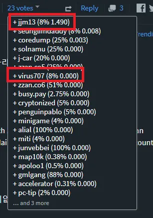 그래서 위의 캡쳐처럼 @virus707이 8% 보팅(sct기여액은 0이지만 스팀잇에서는 $ 1.1정도로 찍힙니다.)과, @jjm13이 8%의 보팅을 하고 있습니다.(sct기여액은 1.49 로 나오지면 스팀잇에서는 거의 찍히지 않음)