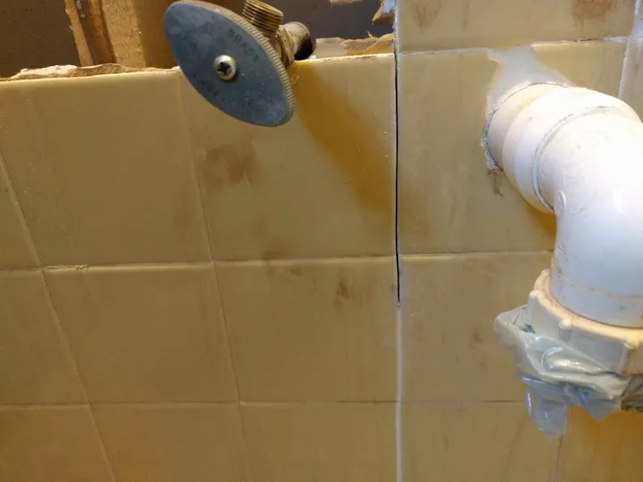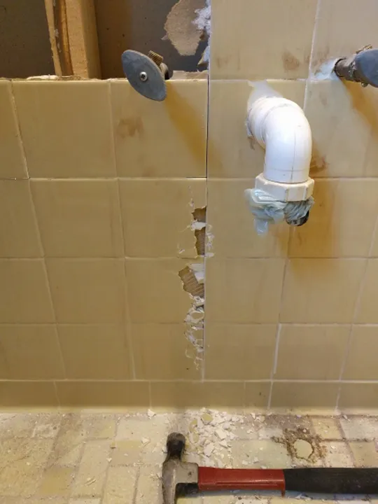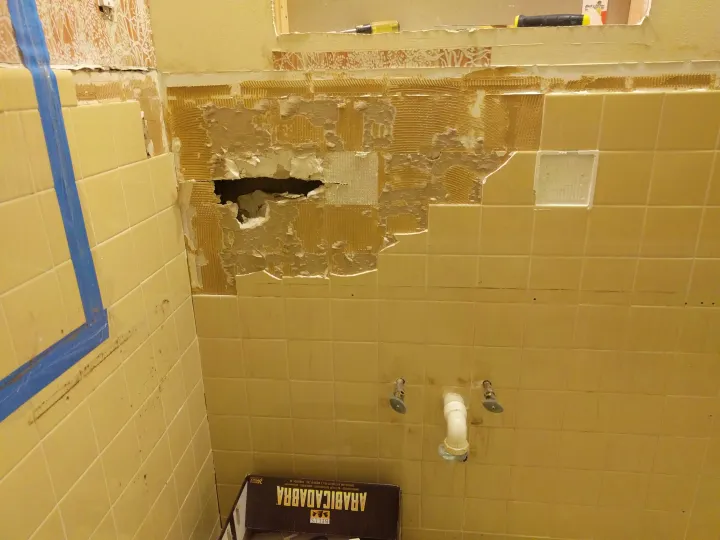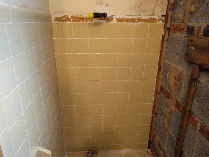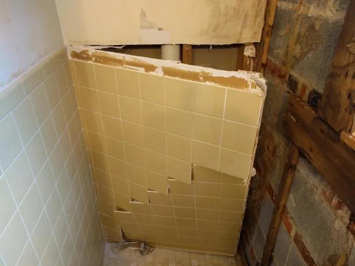 바닥 타일도 어차피 떼어낼 예정이므로, 벽에 붙은 지역을 먼저 깼습니다.