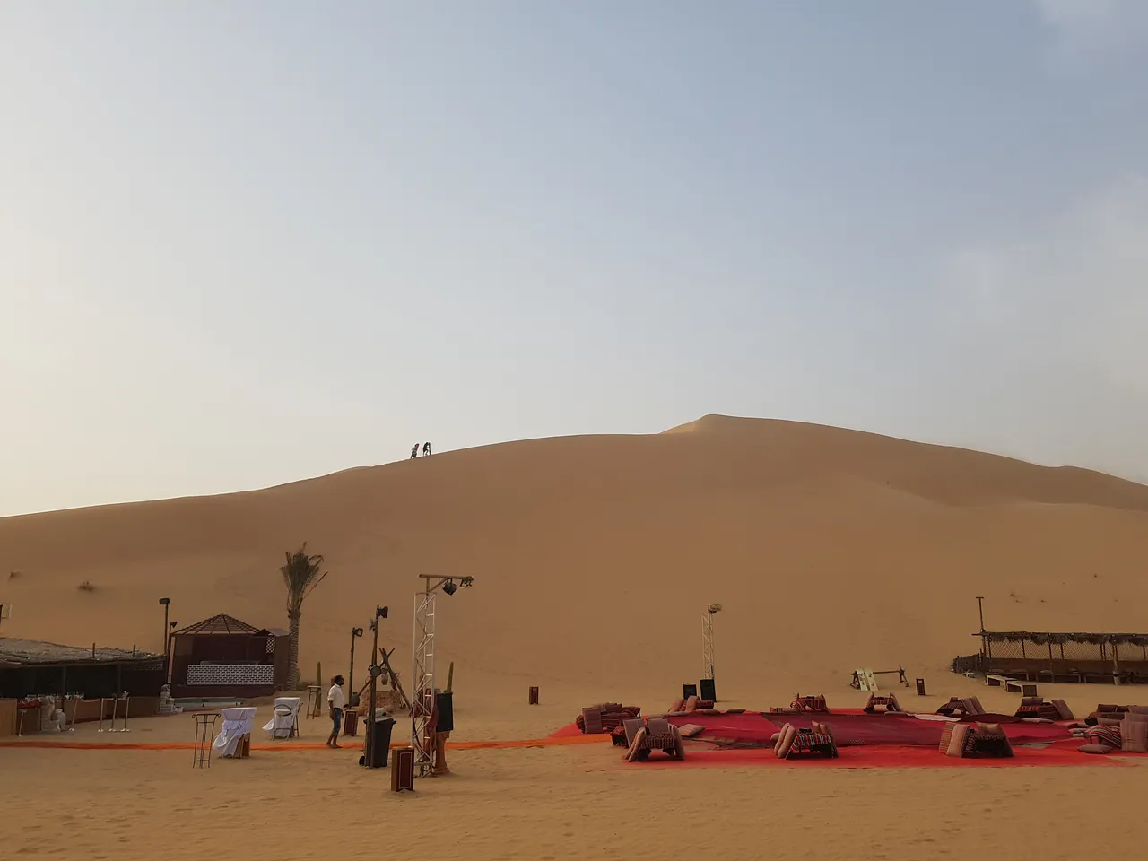 모래 언덕을 지난 후에는 낙타 농장에 잠시 들러 사진을 찍은 후 사막 사파리 캠프로 이동한다. 사막 캠프는 여러 여행사가 함께 사용하는 곳으로, 낙타 타기, 샌드 보드 타기, 차 마시기, 저녁 식사를 할 수 있다.