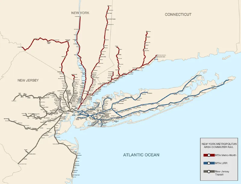 [뉴욕 통근열차 노선도. 여기에 지하철 노선도를 합쳐놓으면 서울 지하철 못지 않게 복잡하다]