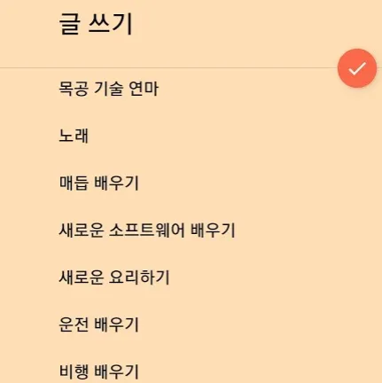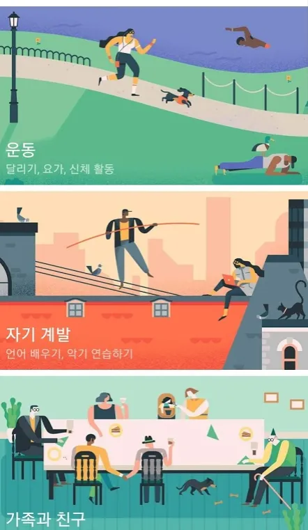운동 / 자기 계발 / 가족과 친구 ㅜㅜ / 나만의 시간 / 계획적인 생활