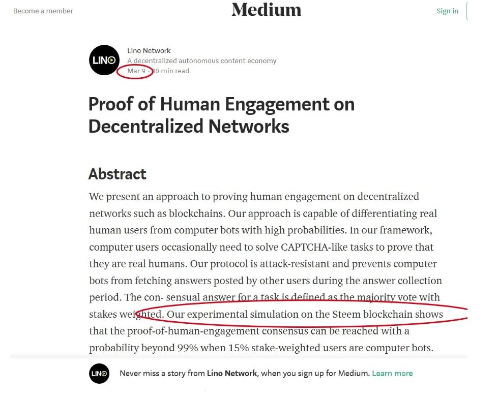 Lino 블록체인 팀에서는 초기부터 스팀잇에서 "실험" 을 하고 있었음을 공개적으로 밝힘: 아래 스샷에서 볼 수 있듯이, 올해 3월 9일에 medium (스팀잇과 비슷한 개념의 사이트) 에 "our experimental simulation on the Steem blockchain" 이라고 당당히 말하고 있습니다.
