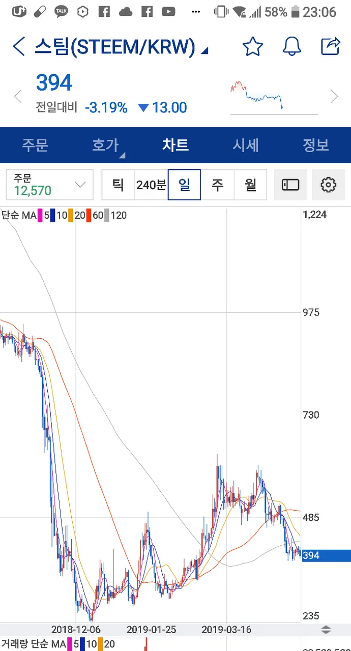 이어서 일봉 그래프를 보면 저점은 완만한 기울기로 높여 가고 있지만 120 이동평균선을 아래로 뚫고 횡보하고 있네요.