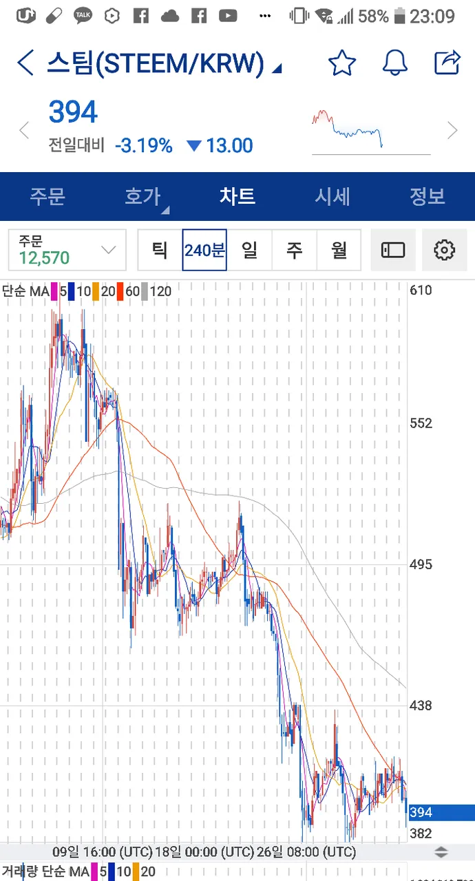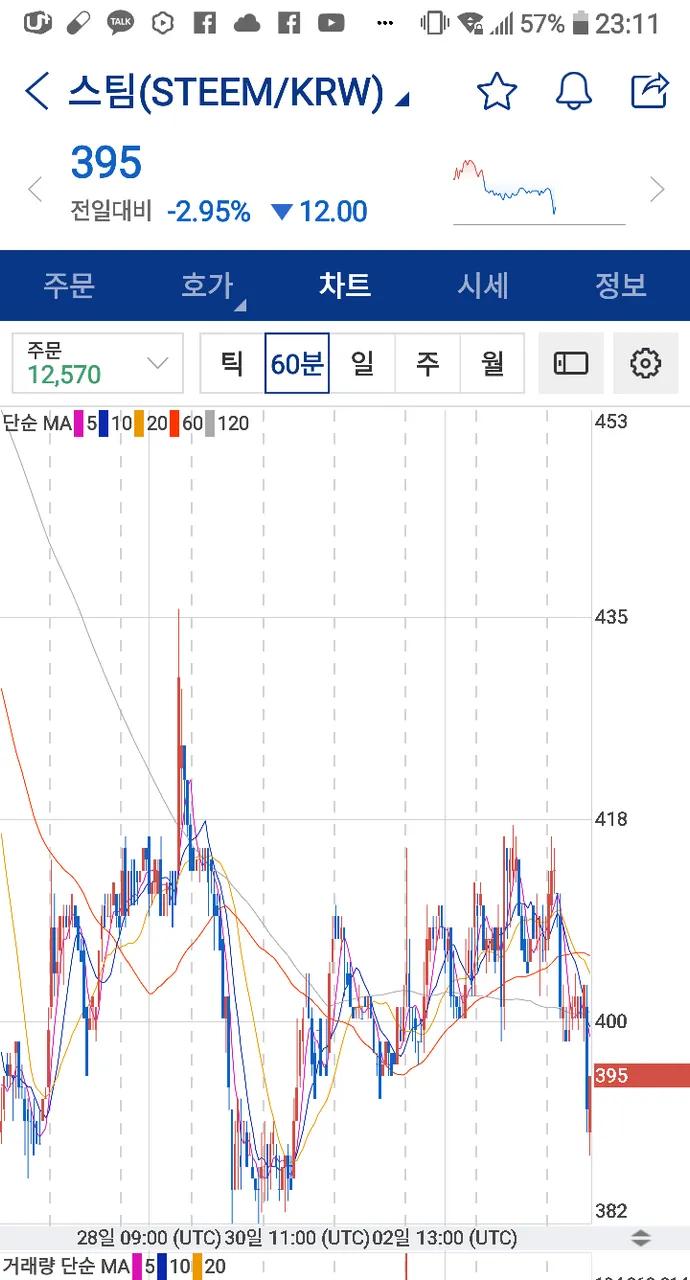 60분 봉 그래프만 보면 스팀 가격이 박스 안에서 단기간에 격렬한 변동성을 보이고 있어요.