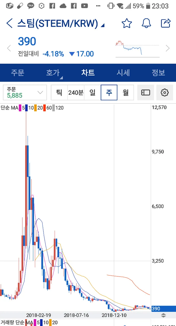 마지막으로 주봉 그래프를 보면,  스팀 가격 394원이 52주 최저 가격 235원에서 그리 높지 않은 위치(1.7배의 가격이지만 주봉 그래프에서는 거의 눈에 띄지 않는 차이)에 있다는 것을 알 수 있어요.
