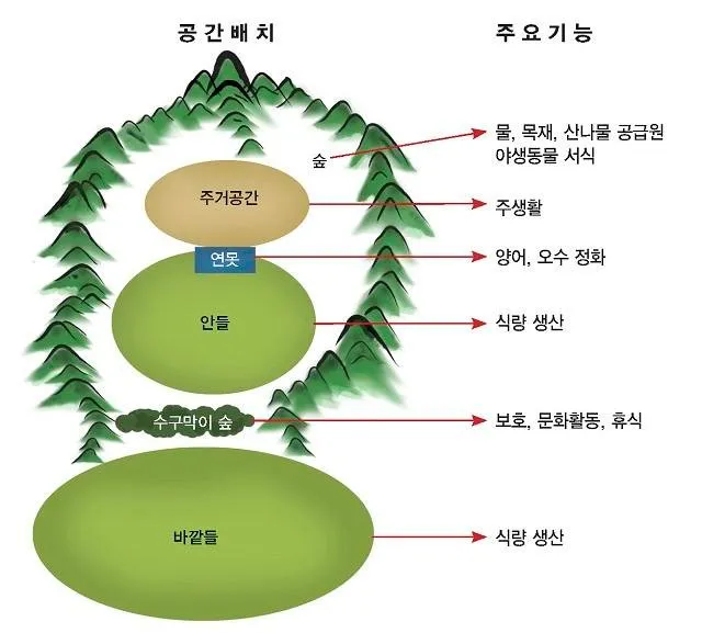 기(氣)2라는 것이 신비로운 것이 아니라 생명체가 타자와의 관계를 유지하면서 활동하는 바탕에너지로 이해한다면 이 에너지(영양물질 포함)가 바람에 의해서 순환되고 물에 닿게 되면 쌓이게된다는 지극히 상식적인 원리인 것이다. 아래의 그림처럼 결국은 산이 감싸주고 앞마당에 물이 흘러 나아가는 그 중앙지점에서 삶의 에너지원이 쌓이고 순환한다는 것이다. 모든 문명의 비옥한 땅이 강유역에서 형성되었다는 것을 생각하면 이해가 쉽게된다.