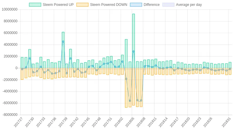 위의 그림과 도표는 2018년, 올해 16주 동안(17~31주차)에 회원들의 스팀파워 Up과 Down의 동향을 나타냅니다. 수치 및 차트를 해석하자면 스팀잇내 SP총량붓밖이 스파/총발행량의 70%의 –0.97%~0.91%정도 수준입니다. 전체 스팀파워 대비 1%미만의 변동성이지요. 이는 스팀투자자들의 자금 이동에 있어서 균열이 그렇게 크지 않다는 것을 뜻합니다. 스팀잇내의 창작형 투자자가 돈을 회수하고 나가려고 하지 않는다는 뜻이지요.