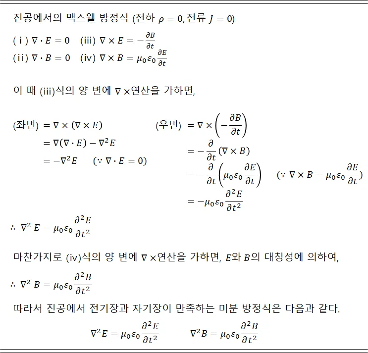 그의 가장 빛나는 업적도 이와 같은 수학적 통찰력에서 비롯하였네. 그는 다음의 계산에서 전자기장이 갖는 완전히 새로운 성질을 발견해 내었다네. 간단한 미분 연산이니 자네도 한 번 눈으로 따라가 보게. 혹여 수학을 모르더라도 이렇게 단순한 계산에서 전자기장의 성질이 통찰되었다는 사실 정도만 알아두게.