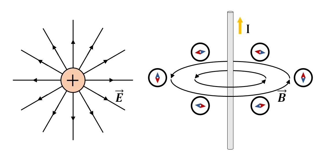 이 때 단위 전하와 단위 전류의 세기는 쿨롱과 앙페르를 기려 각각 1쿨롱(C)과 1암페어(A)라 한다네. 그림 3은 전기장(E)과 자기장(B)의 원인으로서 전하와 전류를 표현하는 그림이라네. 다만, 여기서 후자의 경우 엄밀하게는 전류가 받는 힘과 자기장의 방향이 서로 수직하도록 정의됨을 주의하게.