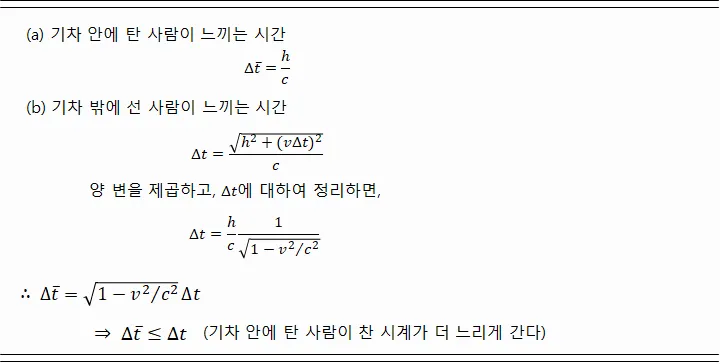 그림 3은 달리는 기차 안에서 전구로부터 나온 빛이 바닥에 도달하는 동일한 사건을, 각각 기차 안과 밖에서 관찰함을 표현하고 있네. 그리고 자네가 보듯, (a)보다 (b)에서 빛이 이동하는 경로가 길어짐을 확인할 수 있다네. 그렇다면 (속도) = (거리)/(시간)인데, 공준에 따라 빛의 속도는 일정하고, 관찰된 거리는 늘어났다는 것은 무엇을 의미하겠나? 즉, 관찰된 시간도 함께 늘어났다는 말이 되네. 쉽게 말해, (b)의 관찰자가 찬 시계가 (a)의 관찰자가 찬 시계보다 빠르게 간다는 말일세. 수식을 세워 명확하게 표현하자면 아래와 같네.