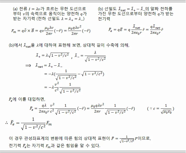 내 이론에 의하면 그림 5야말로 동일한 물리 현상이라네. (a)의 달리는 관찰자가 보기에, 전류를 이루는 양전하는 정지하므로 그 사이 간격이 팽창하여 선밀도 λ+가 작아지게 되고, 반대로 상대 운동을 하게 되는 음전하는 그 간격이 수축하여 선밀도 λ-가 커지게 되니, 관찰자의 눈에는 (b)의 모습과 같아지는 것일세. 그리고 양전하와 음전하 사이의 차이가 알짜 전하량을 만들어 전기력으로써 도선 밖의 전하에 힘을 가하는 것이지. 아울러 아래와 같이 수학을 동원하면 (a)에서의 자기력과 (b)에서의 전기력이 동일한 힘임을 확실하게 확인해, (a)와 (b)에 동일한 물리 법칙이 적용되고 있음을 알 수 있다네.