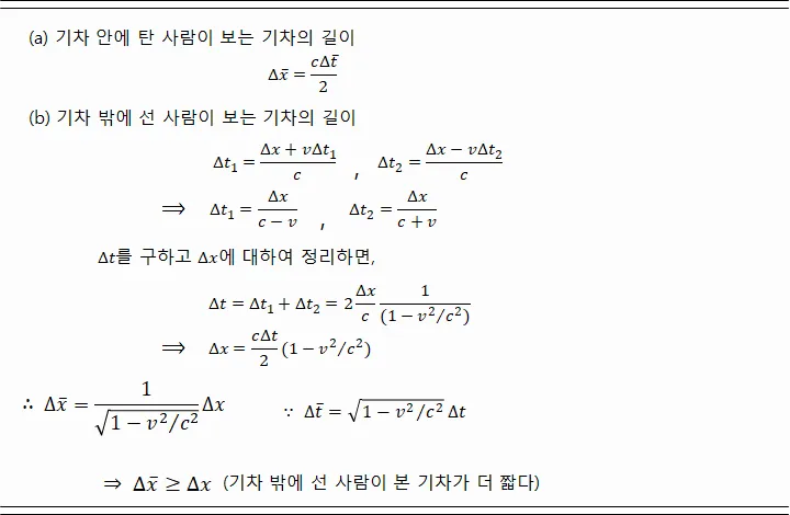 또한 위의 시간 지연 현상에 이어, 그림 4처럼 빛이 한 쪽 벽에서 출발해 반대쪽 벽을 부딪히고 나와 다시 돌아오는 경로를 관찰하였을 때에는, 기차의 길이가 다르게 관찰됨을 알 수 있네. 이 경우에도 빛은 기차 밖에서 관찰할 때 더 긴 경로를 이동하는데, (속도) = (거리)/(시간)에서 (b)의 기차 길이가 (a)에서보다 짧아져야 동일한 빛의 속도를 유지할 수 있는 것이라네. 이는 움직이는 물체가 정지한 물체보다 짧게 보이는 길이 수축 또는 로렌츠 수축 현상으로 불리우네. 정확한 수식은 아래와 같아.