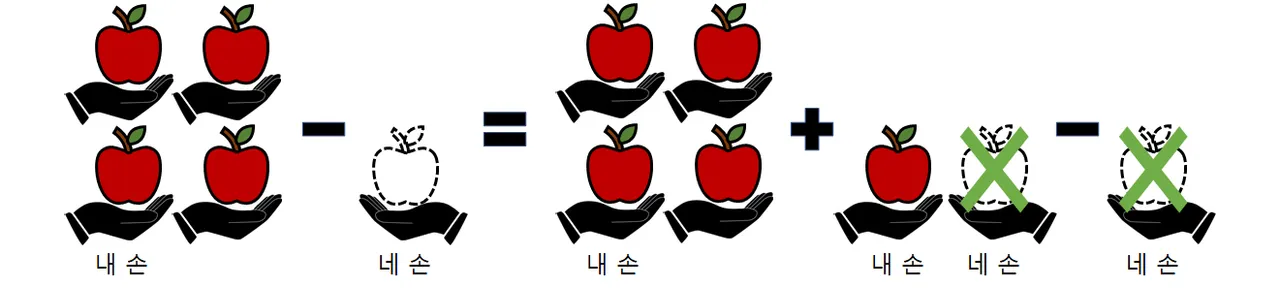 후자의 경우, 동일한 상황에서 자비로운 상대방이 사과 -1개의 빚을 면해 준다면, 4개의 사과에서 다시 -1의 빚을 빼어, 5개의 사과가 내 것이 되는 셈을 떠올릴 수 있습니다.
