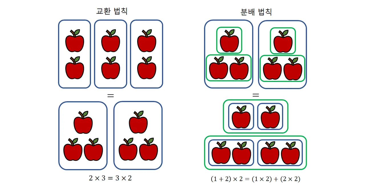 의 등식이 모두 성립함을 의미합니다. 예컨대, 교환법칙은 2 × 3 = 3 × 2 처럼 곱하임수와 곱하는수를 뒤바꾸어도 동일한 값을 갖는 성질을 가리키고, 분배법칙은 (1 + 2) × 2 = (1 × 2) + (2 × 2) 나 2 × (1 + 2) = (2 × 1) + (2 × 2) 처럼 곱하임수(또는 곱하는수) 둘을 먼저 더하고 나중에 곱하든 곱하임수(또는 곱하는수) 둘을 각각 먼저 곱하고 나중에 더하든 동일한 값을 갖는 성질을 가리킵니다.