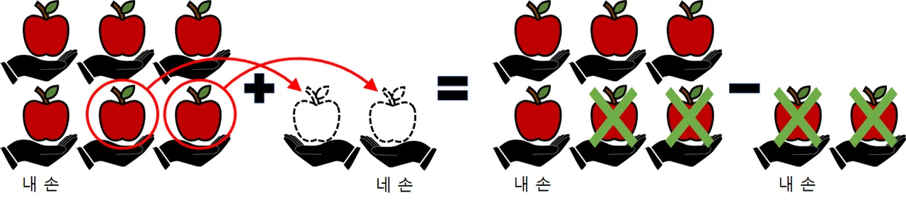 이러한 음수의 성질은 꽤나 직관적입니다. 전자의 경우, 앞선 예시처럼 사온 사과 6개와 빚진 사과 -2개가 있다면, 사온 사과 중 2개는 갚아야 할 몫으로, 6개에서 2개를 뺀 4개의 사과가 내 몫이 되는 셈을 떠올릴 수 있으며,