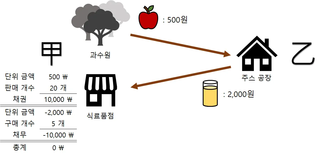 위의 그림에서, 갑(甲)은 과수원을 운영하며 을(乙)에게 사과를 판매하고, 동시에 식료품점을 운영하며 을(乙)로부터 주스를 구매합니다. 아울러 갑(甲)은 을(乙)과의 빈번한 거래 관계에 따른 대금 지급의 번거로움을 피하고자 월말에 채권-채무를 정산하고 있으며, 현재 그가 갖는 채권-채무의 합계액이 (500 × 20) + (-2,000 × 5) = 0 인 상태입니다. 이때 갑(甲)은 다음과 같은 상황을 맞이하고, 다시 채권-채무의 합계를 계산하려 합니다.
