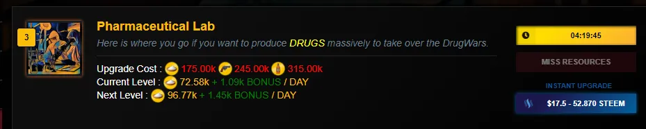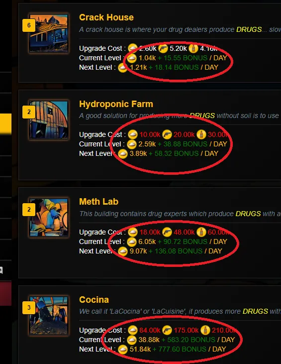 요렇게 레벨별로 드럭의 생산량이 day로 표기됩니다.