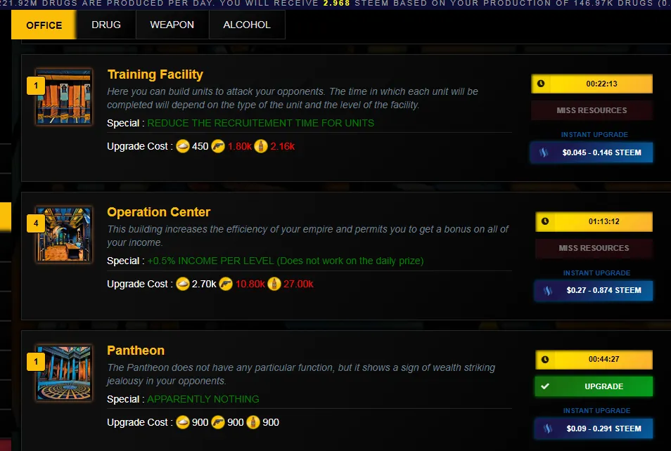 용병관리와 관련된 빌딩은 오피스의 리서치센터가 있는데 이건 15랩이상에서 열리는 거라서 현재는 못보고있습니다. 리서치 센터가 열리면 용병들의 기술랩업이 가능합니다.