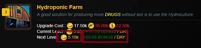 수확량이 증가할 수록 복리로 증가하는 효과가 있으니 수행본부 업그레이드는 필수입니다