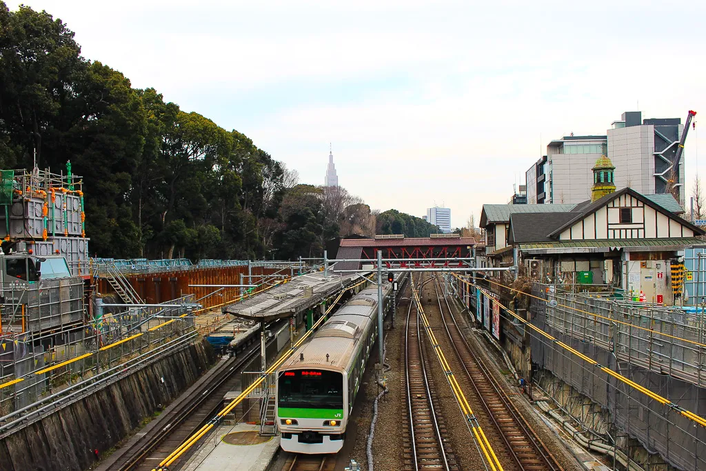 오른쪽에 하라주쿠 역을 끼고 왼쪽에 있는 다리를 지나면 요요기 공원인데요. 시간도 조금 남을 것 같아서 공원을 한 번 둘러보기로 했습니다. 하라주쿠 역 부근으로 공사를 하는 모습이었네요.