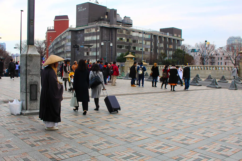 그렇게 잠시 숲을 둘러보고 나왔습니다. 사진은 공원 입구 다리에서 찍었는데.. 뭔가 과거와 현재가 공존하는 것 같은 느낌으로다가 찍어봤네요. 시주를 받는 스님과 그 바로 맞은 편에는 아이돌 같은 친구들이 공연을 하고 있고.. 저 멀리는 빌딩 숲.