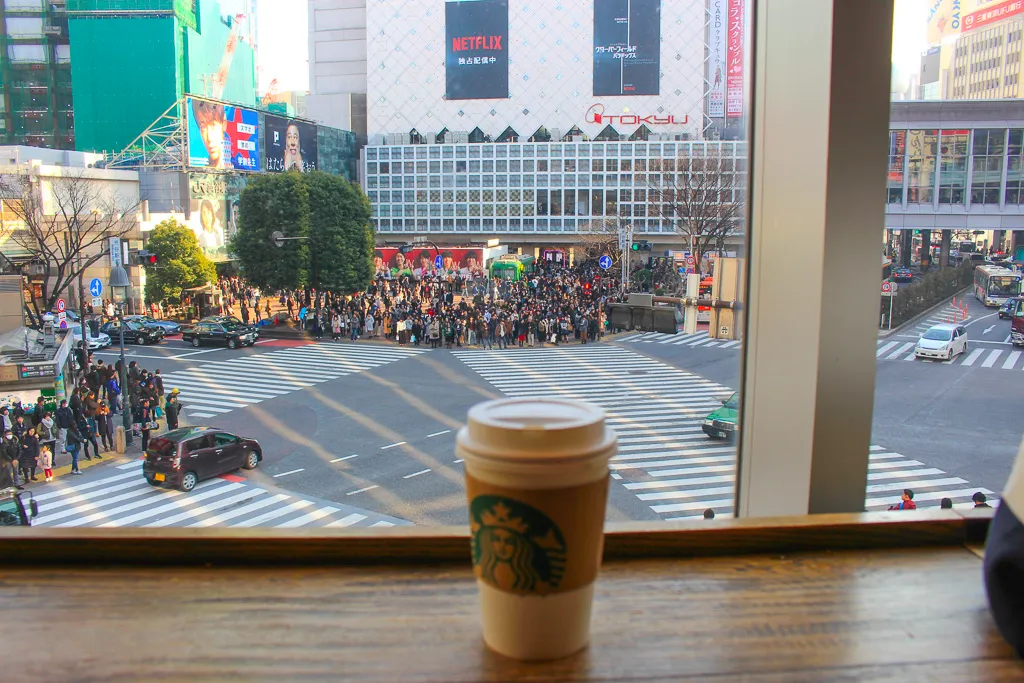 하루에도 몇십만명이 지나다닌다는 인파를 좋은 자리에서 구경하기 위해 교차로 건너편 '츠타야의 스타벅스'에 자리를 잡았습니다.