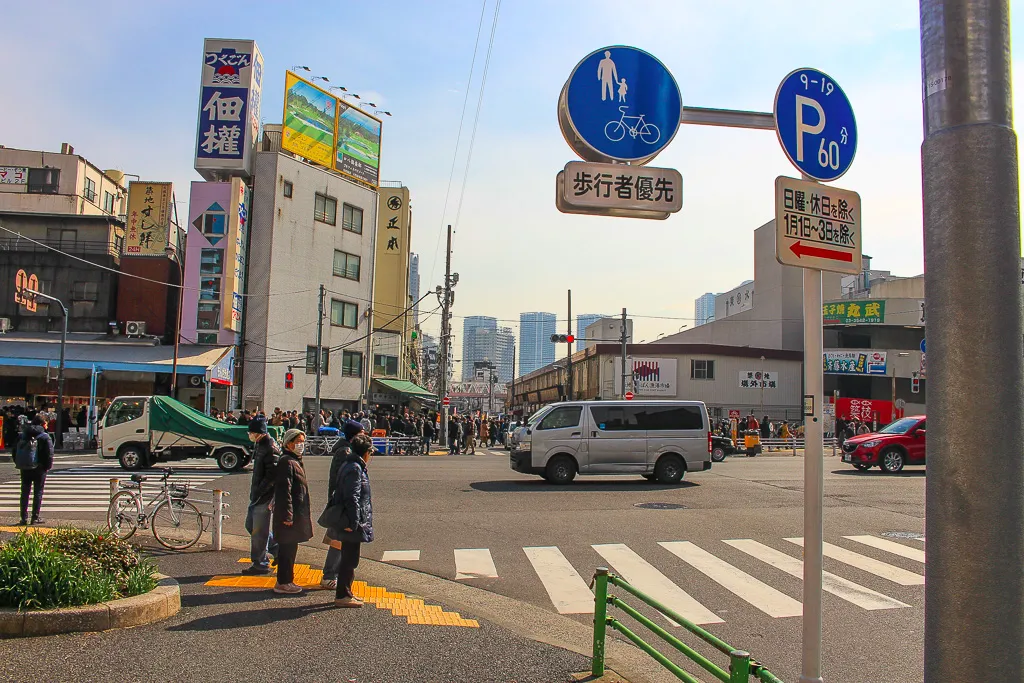 긴자에서 1km 정도에 있는 쓰키지 시장을 구경하러 가기로 했습니다. 이곳은 수산물 전문 도매시장이지만 수산물 외에도 식료품, 잡화 등을 판매하는 상점들이 모여 있는 곳이에요. 약 400여 상점이 있다고 하는데요. 도쿄에서의 삐까뻔쩍 높은 빌딩도 좋지만, 이런 사람이 웅성대고 활기찬 시장도 궁금하더라구요.