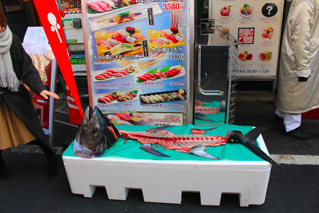 요 사진은 스시 가게 앞에 있던 해체 된 참치! 누가 막 만지던데 아마 플라스틱이겠죠? 아주 리얼하게 잘 표현되어 있네요ㅎㅎ