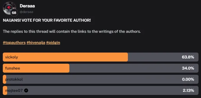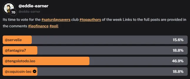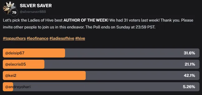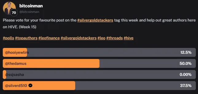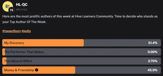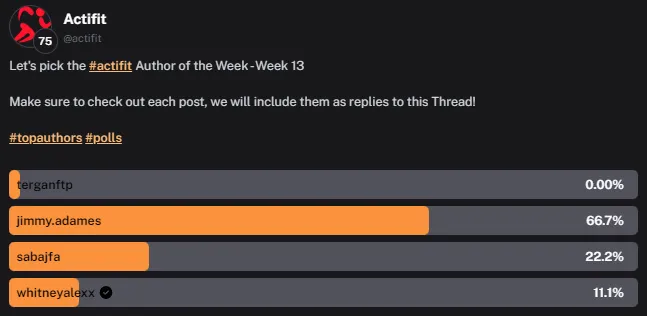 If you want to get involved in these Decentralized Curation polls, be on the lookout for the announcements using the #topauthors tag on Hive, and/or make sure to check out the #topauthors tag on Threads to vote on these polls during the weekend.