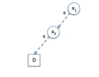 Secondly, we can share identical subtrees. That means that we can connect an assignment Edge to an already existing Node instead of creating a new Node everytime, when the Nodes contained inside of this subtree are the same (identical). Think of an function that gives us 1 when we have odd parity (odd number of 1's in input) and 0 when we have even parity( even number of 1's in input). Some parts can be shared and that way instead of 15 Decision Nodes and 2(or 16) Derminal Nodes we can have 7 Decision Nodes and 2 Terminal Nodes.