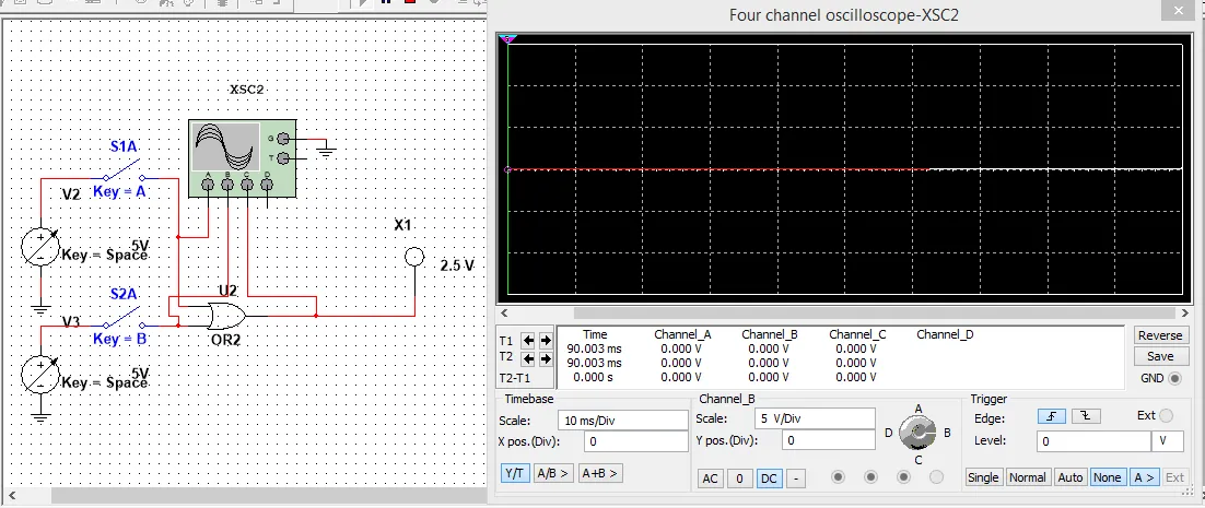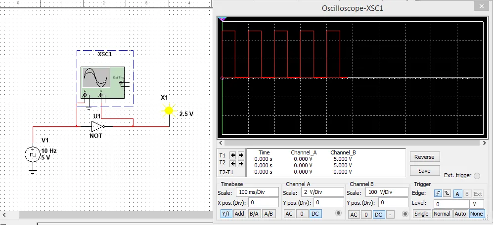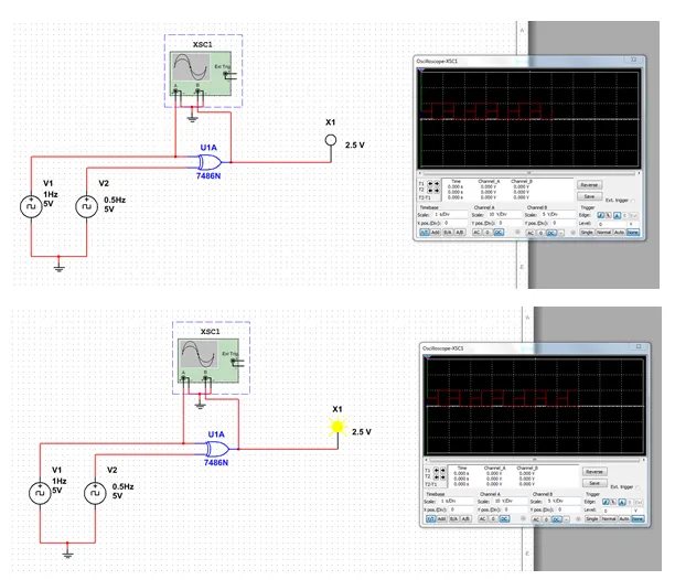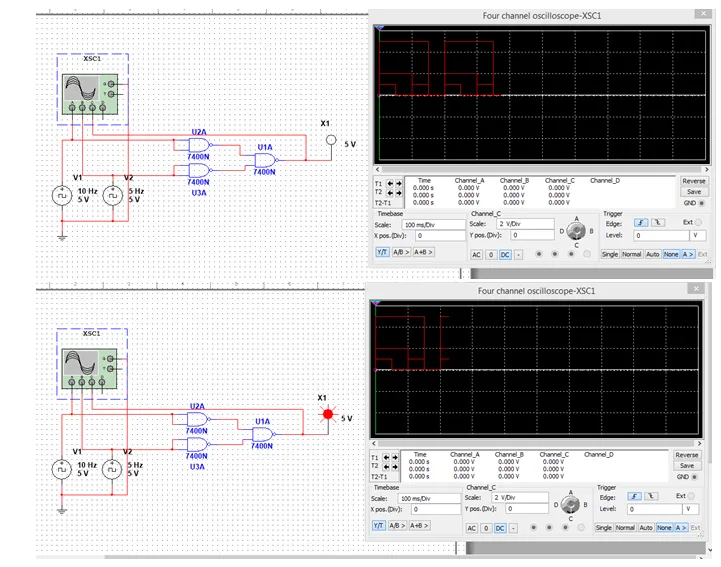 As you can see from the Waveform in the Oscilloscope, where I put different Scales for each different Input, the Probe lights only when the Outputs are 0 and 1 or vise versa that means they differentiate!
