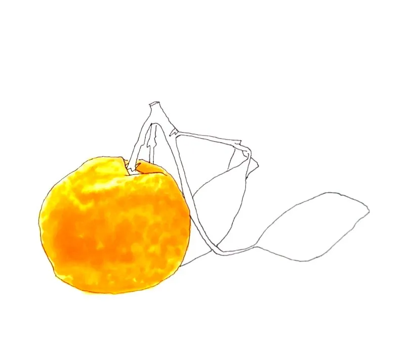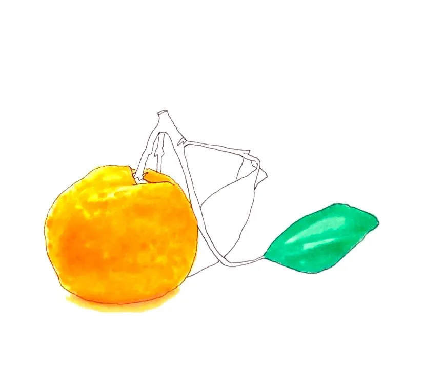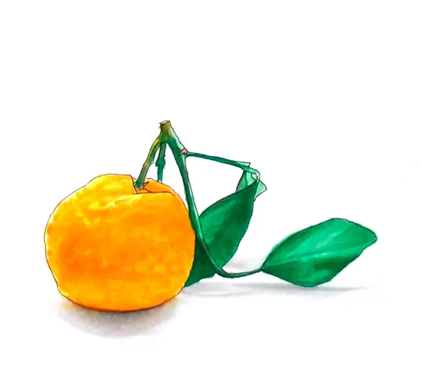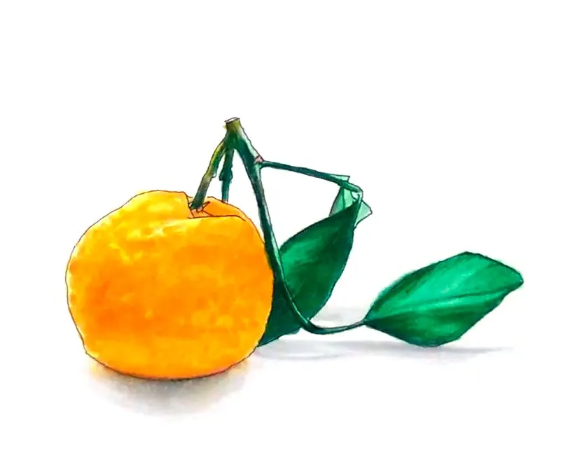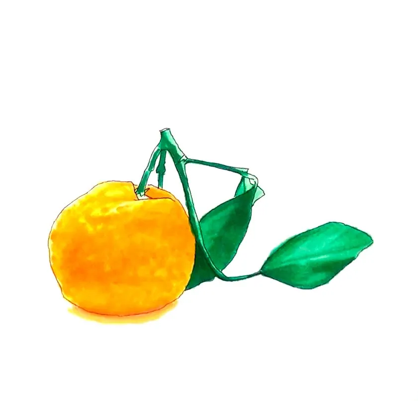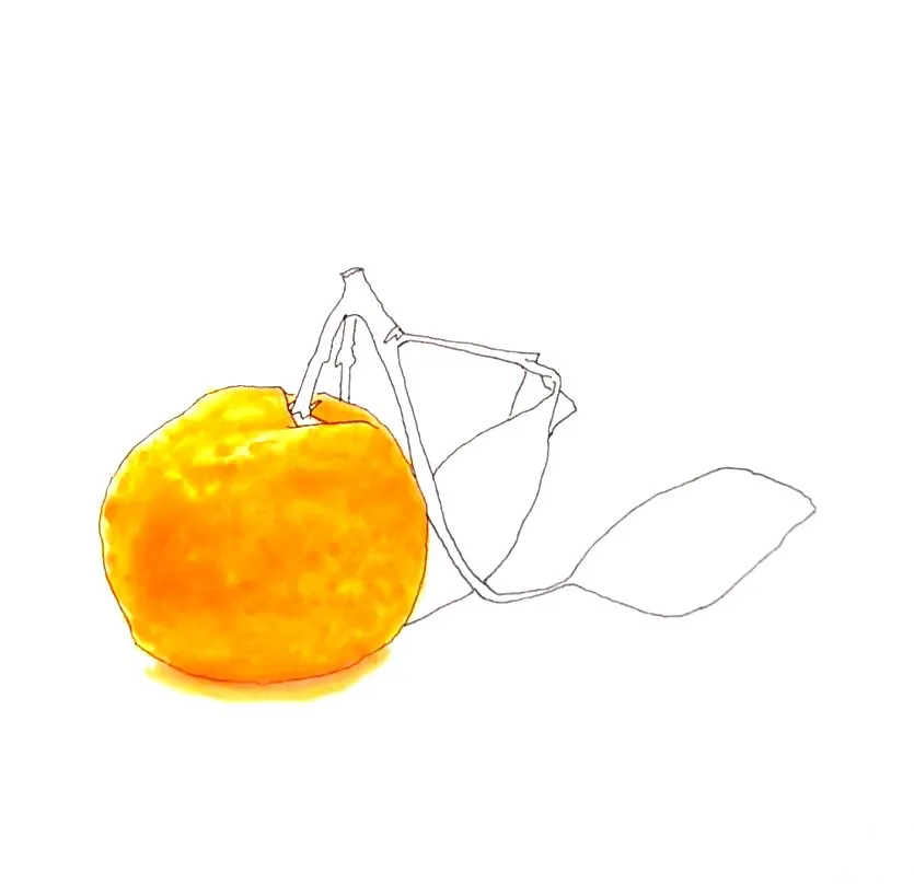 contour lines. I use a white gel pen to enhance the glare on the mandarin and add contrast to the leaves.