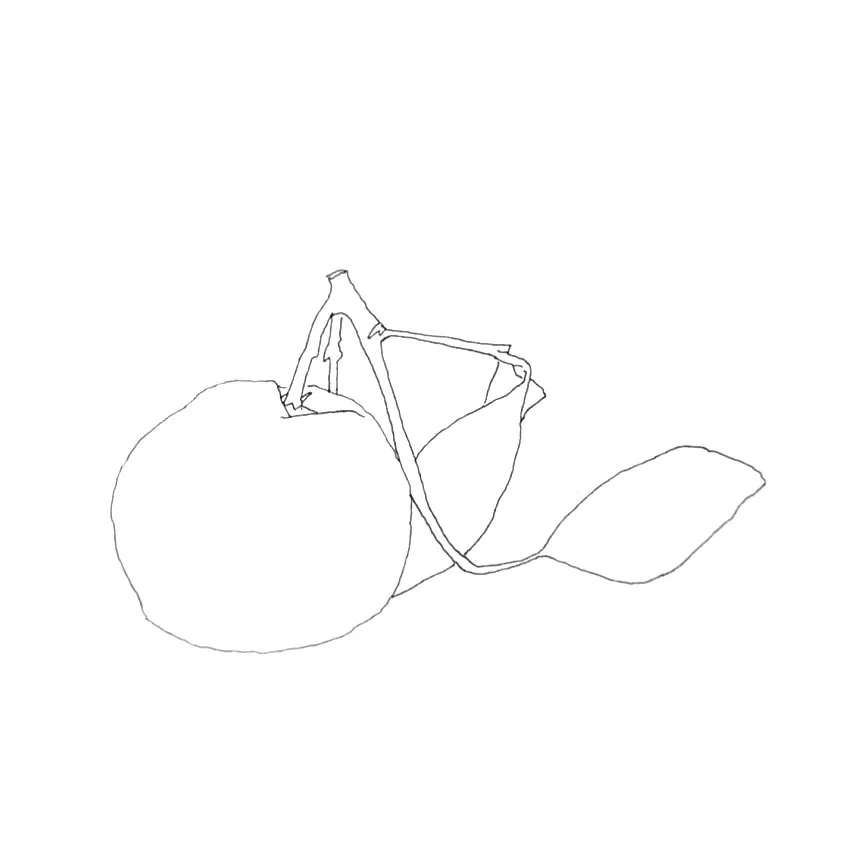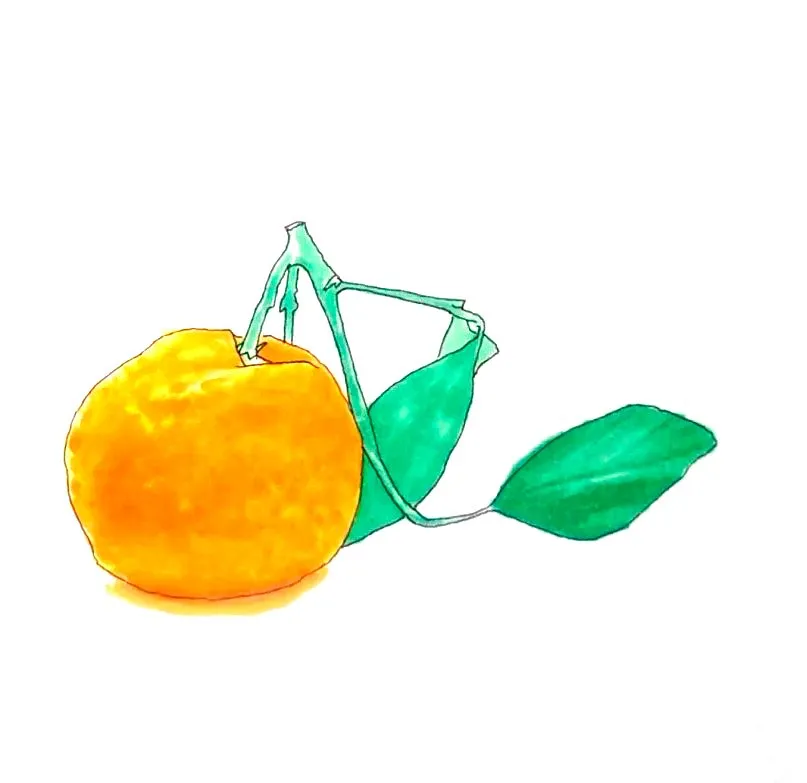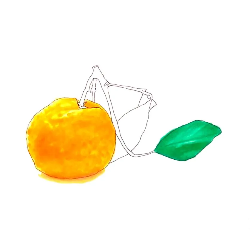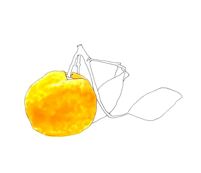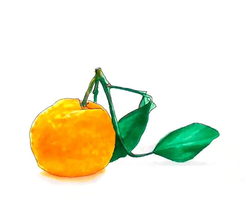 contour lines. I use a white gel pen to enhance the glare on the mandarin and add contrast to the leaves.