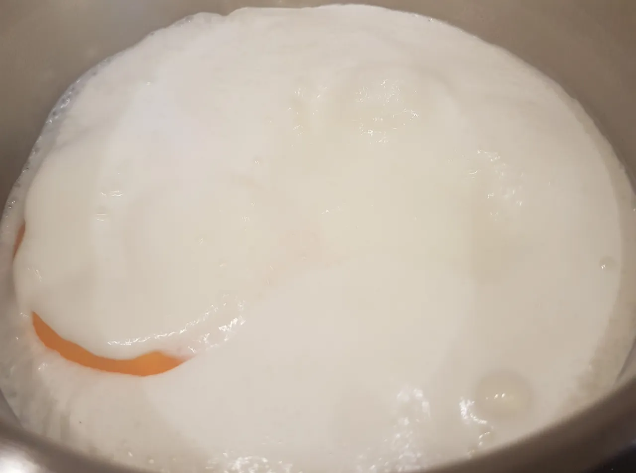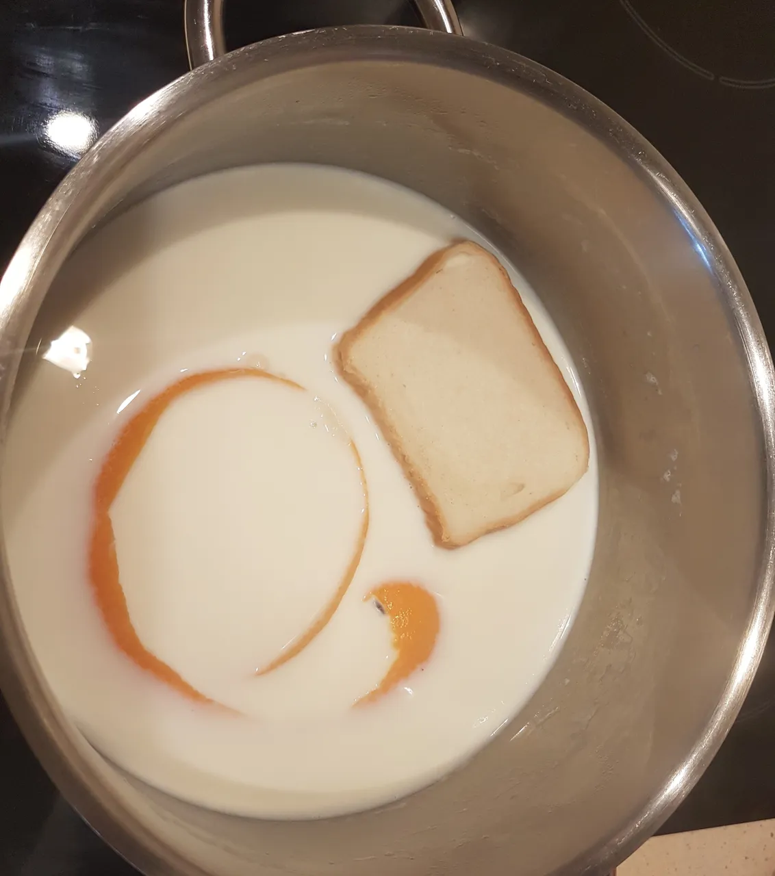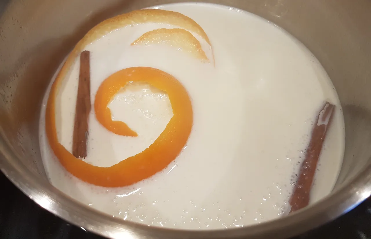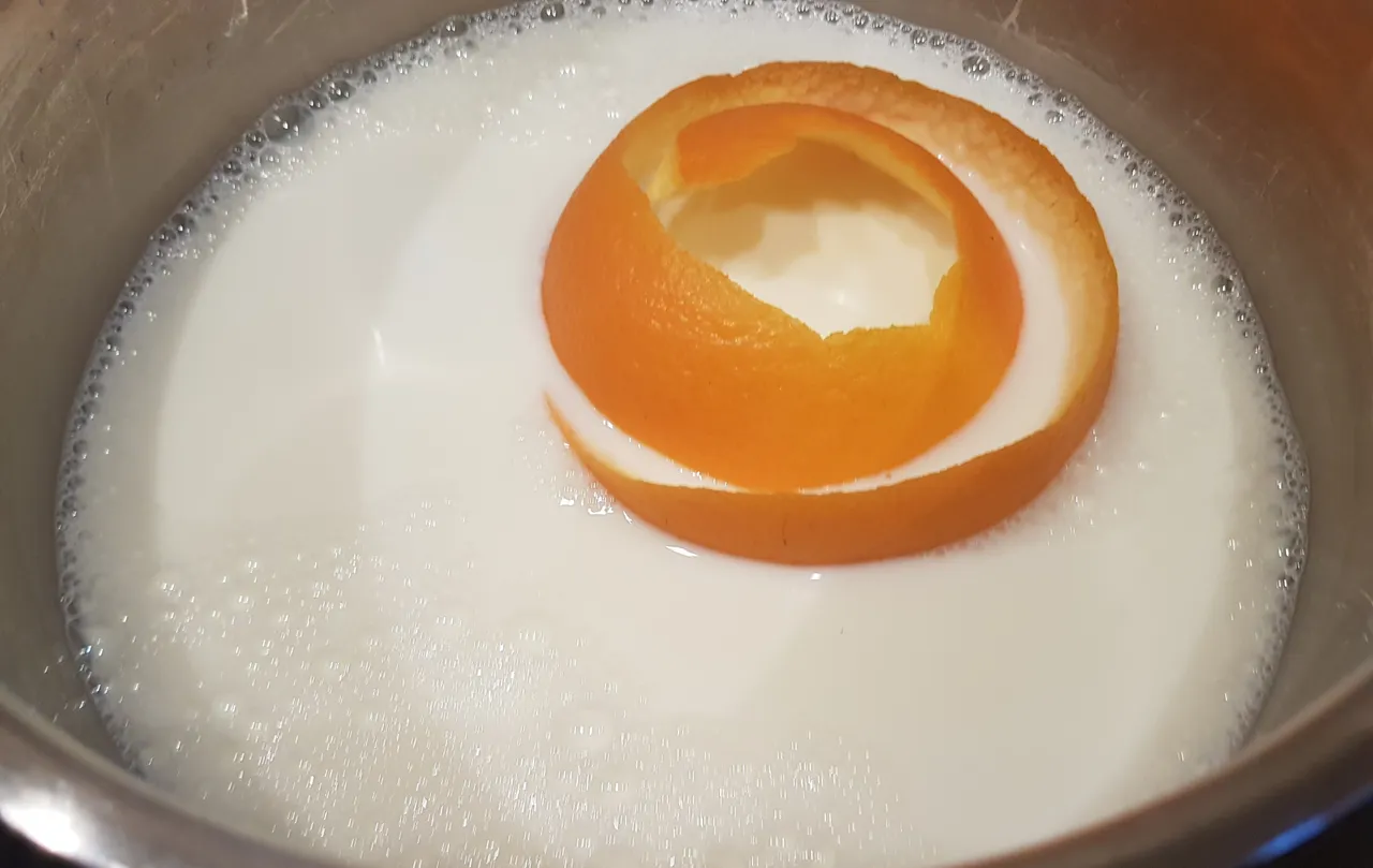 Ponemos la leche a calentar en un cazo y añadimos la piel de la naranja sin que la piel contenga el jugo de la fruta.