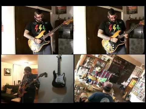 Grabé la batería de mi PukuInstrumento musical a oído y luego procedí a grabar las guitarras, el bajo y las voces a cargo de Valeria Bandes @valeriabandes y Romina Rojas, y finalmente utilizando el efecto pantalla dividida añadí los vídeos en conjunto.