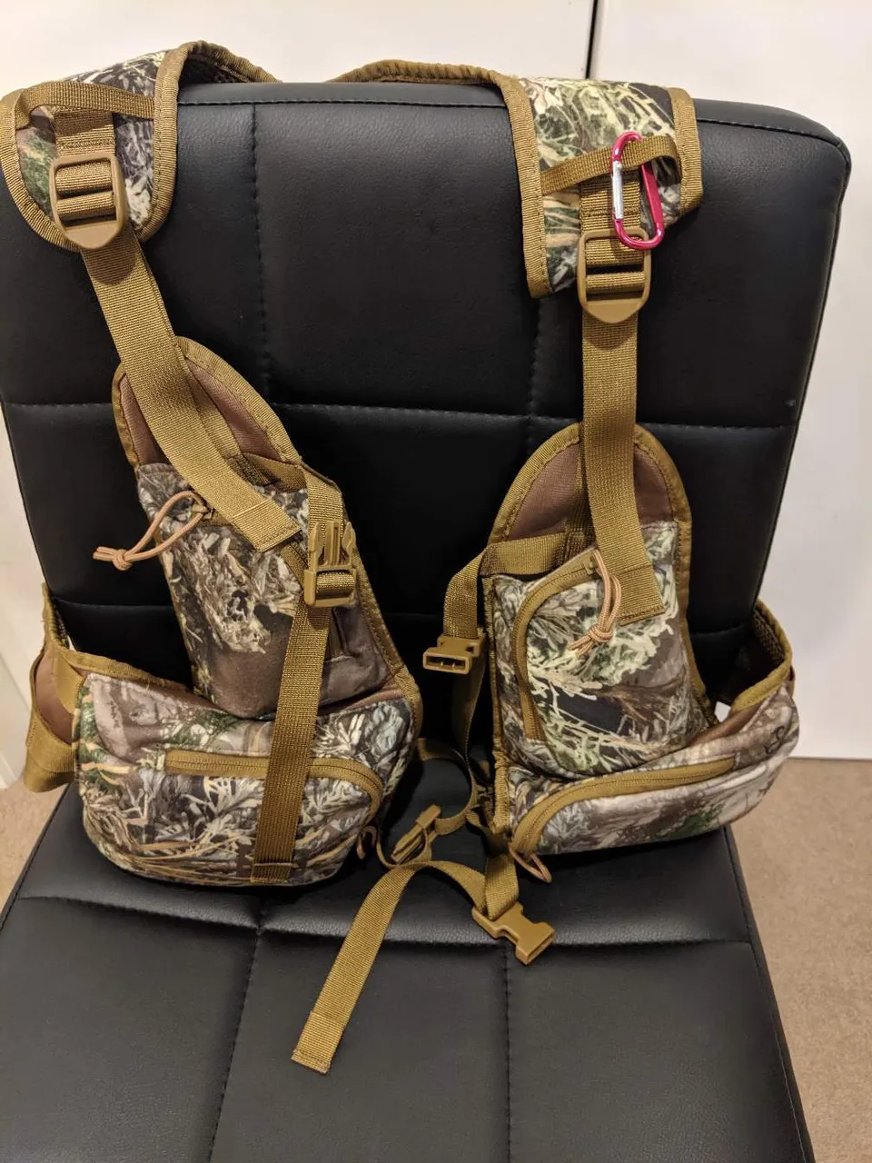 Pursuit vest pack with snacks, Multitool, head lamp and water purification tablets. The pink carbineer attaches the water bottle.