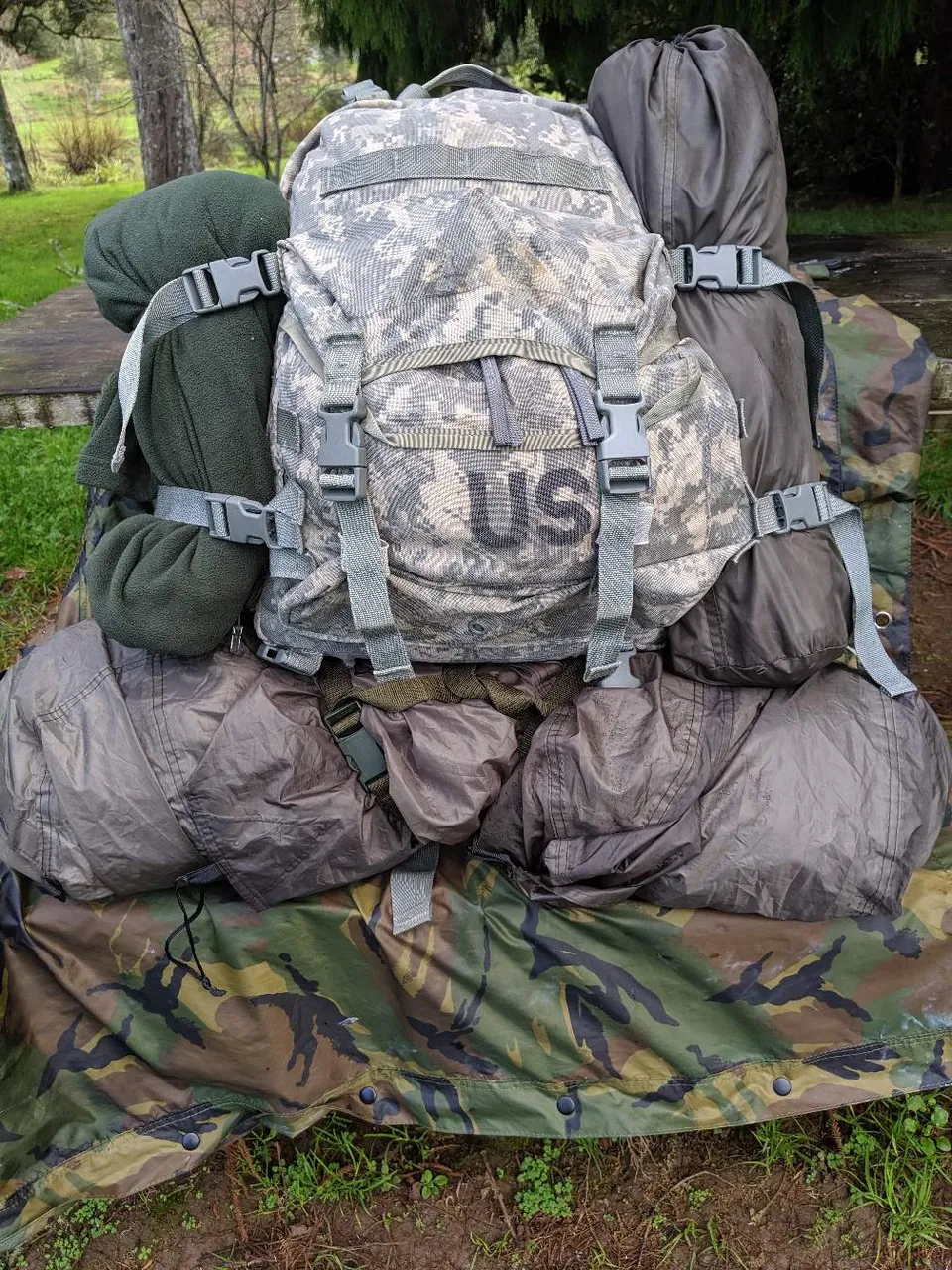 Same pack setup as before with mat added. The 4 woobies are in a compression sack strapped to the bottom of the pack.
