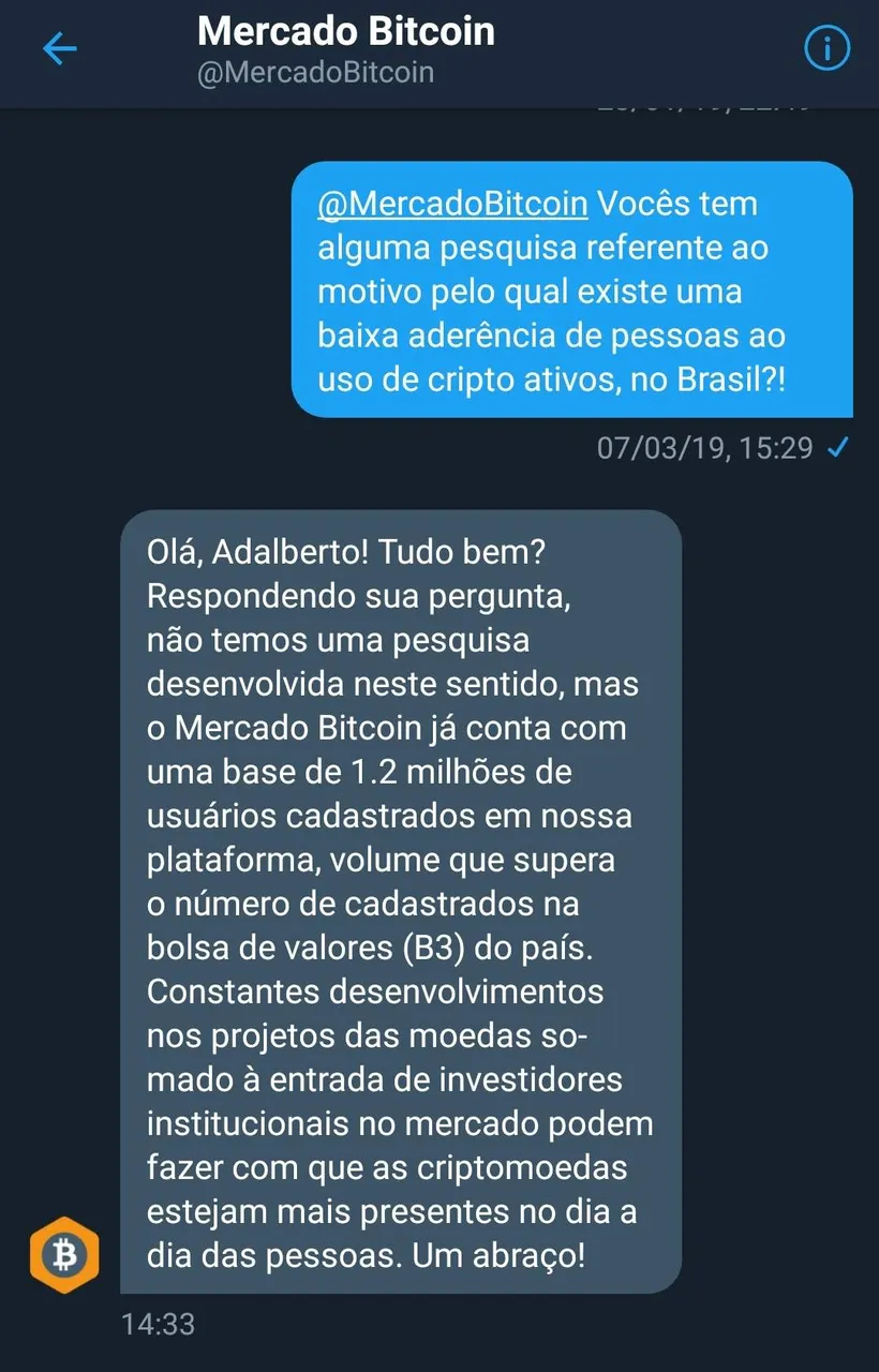 @MercadoBitcoin Vocês tem alguma pesquisa referente ao motivo pelo qual existe uma baixa aderência de pessoas ao uso de cripto ativos, no Brasil?!