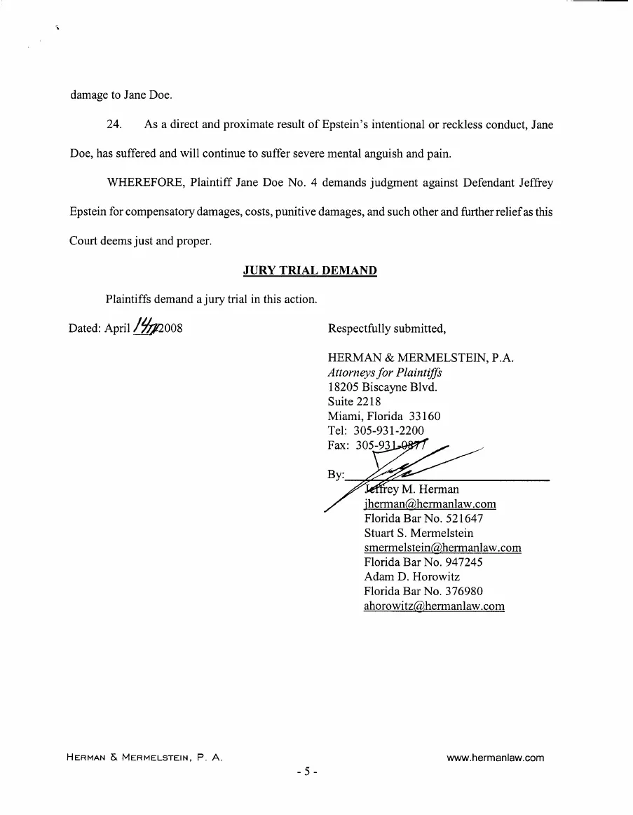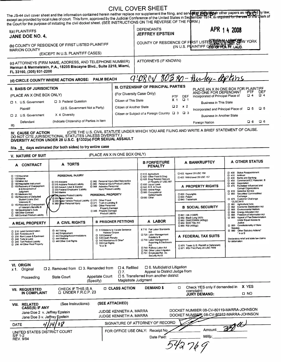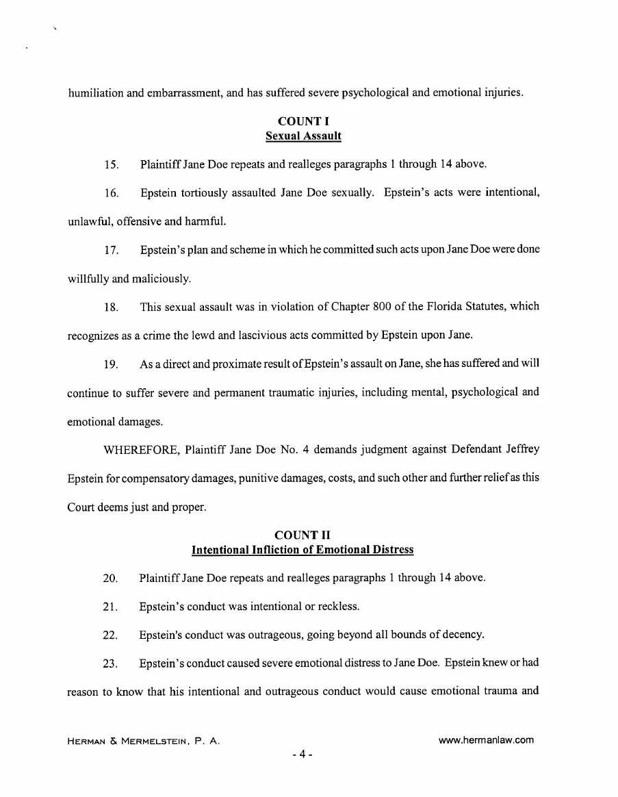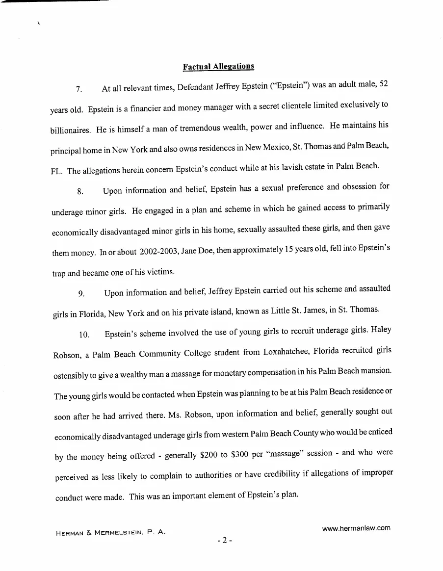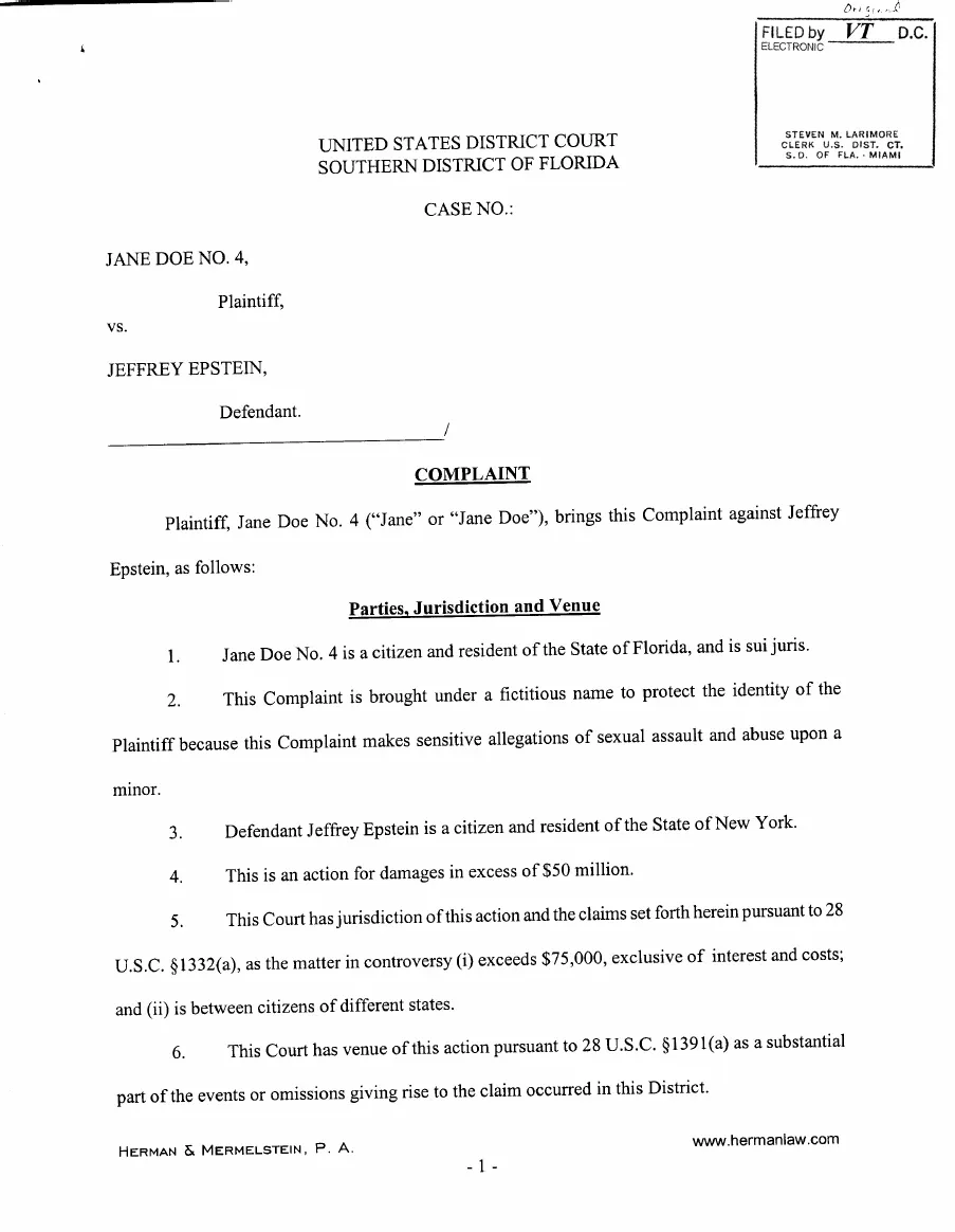 Jane Doe No. 4 filed a lawsuit against Jeffrey Epstein on April 14, 2008. She was only 15 when she was taken to Epstein's island, Little St. James, and molested during a forced massage session. Jane Doe No. 6 filed a similar lawsuit on September 10, 2008, and was 13 at the time of her assault.